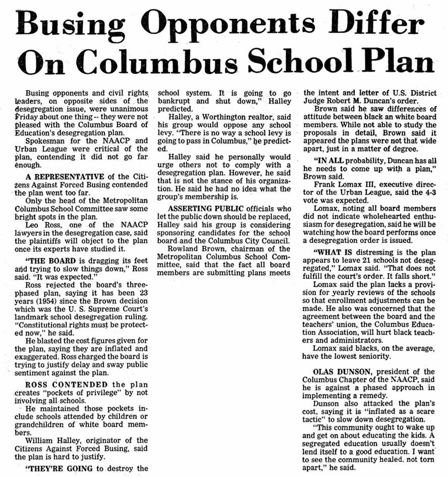 “In 1977, U.S. Circuit Court Judge Robert Duncan ruled in Penick v. Columbus Board of Education that the Columbus school district kept African-American and white students in separate schools by creating boundaries that sent African-American students to predominantly African-American schools and white students to predominantly white schools. Following the ruling, the Board began busing to create a desegregated school district. ” Teaching Columbus.