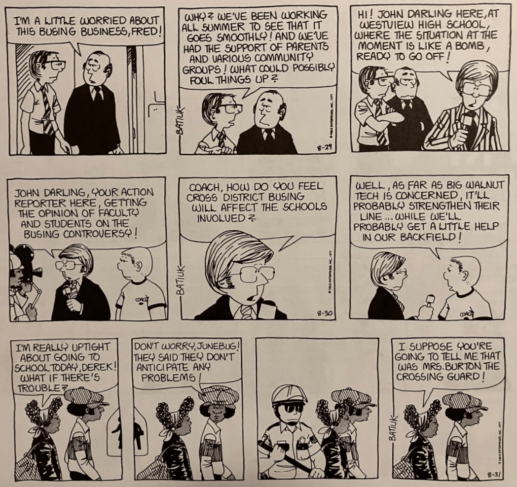 The strip where John Darling interviews Coach Stropp is genuinely excellent, to the point where I’m not sure I could praise it enough. It is irreverent in exactly the right way, demonstrating a keen understanding of and humorously skewering both the racial stereotyping of football positions (which persists, perhaps even more strongly, today) and the shallow level of interest and understanding that a dolt like Coach Stropp would have in busing and school integration.