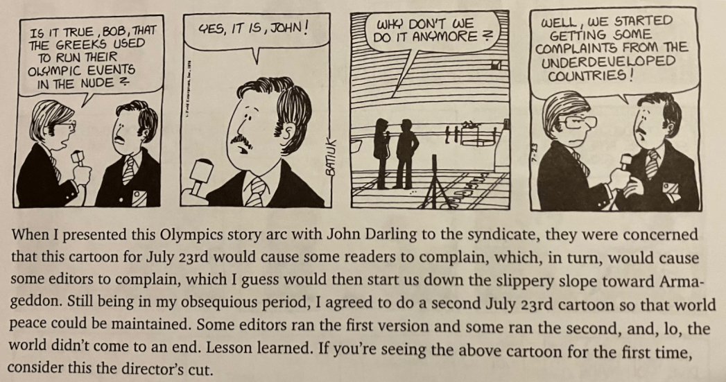 It looks like a real cartoonist with a real style drew it. Imperfections can make something more endearing. Modern-day Batiuk looks to stamp out individuality, like a corporate fast food chain measuring a hamburger patty with a calipers to make sure they’re all the same size nationally.