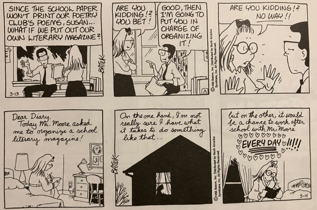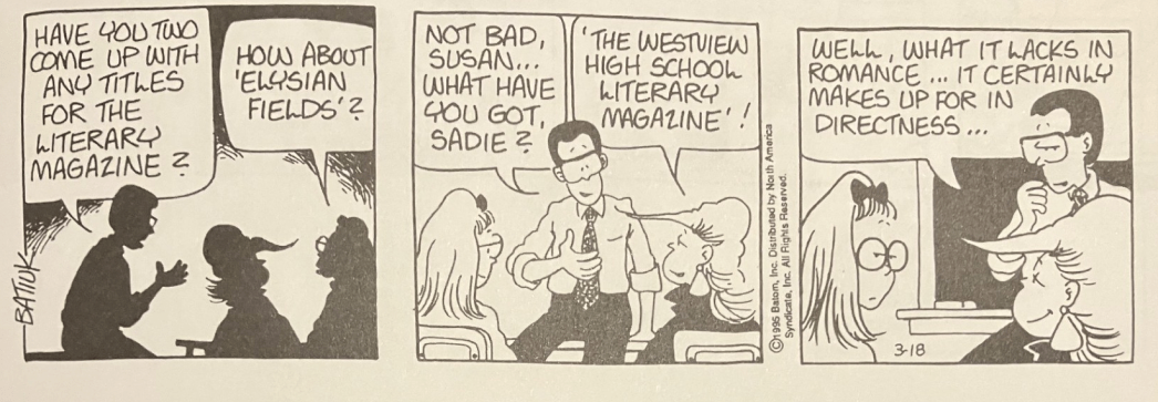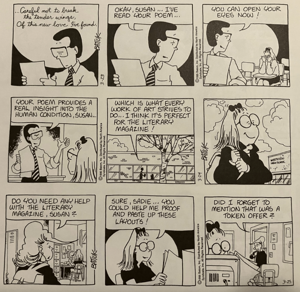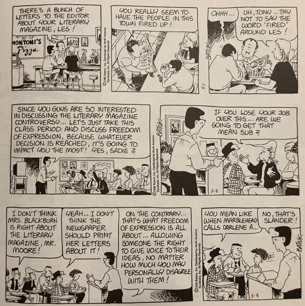 But over the first couple years, Batiuk gradually got a big ‘ol drama ball rolling and slammed it right into the an endless set of VERY SPECIAL ARC ON HOT BUTTON ISSUE DU JOUR pins. And one of the earliest of these prestige arcs, sandwiched between Guns in School and Teen Suicide, was the censorship of the Poetry Club’s school literary magazine that ran in the spring of 1995.