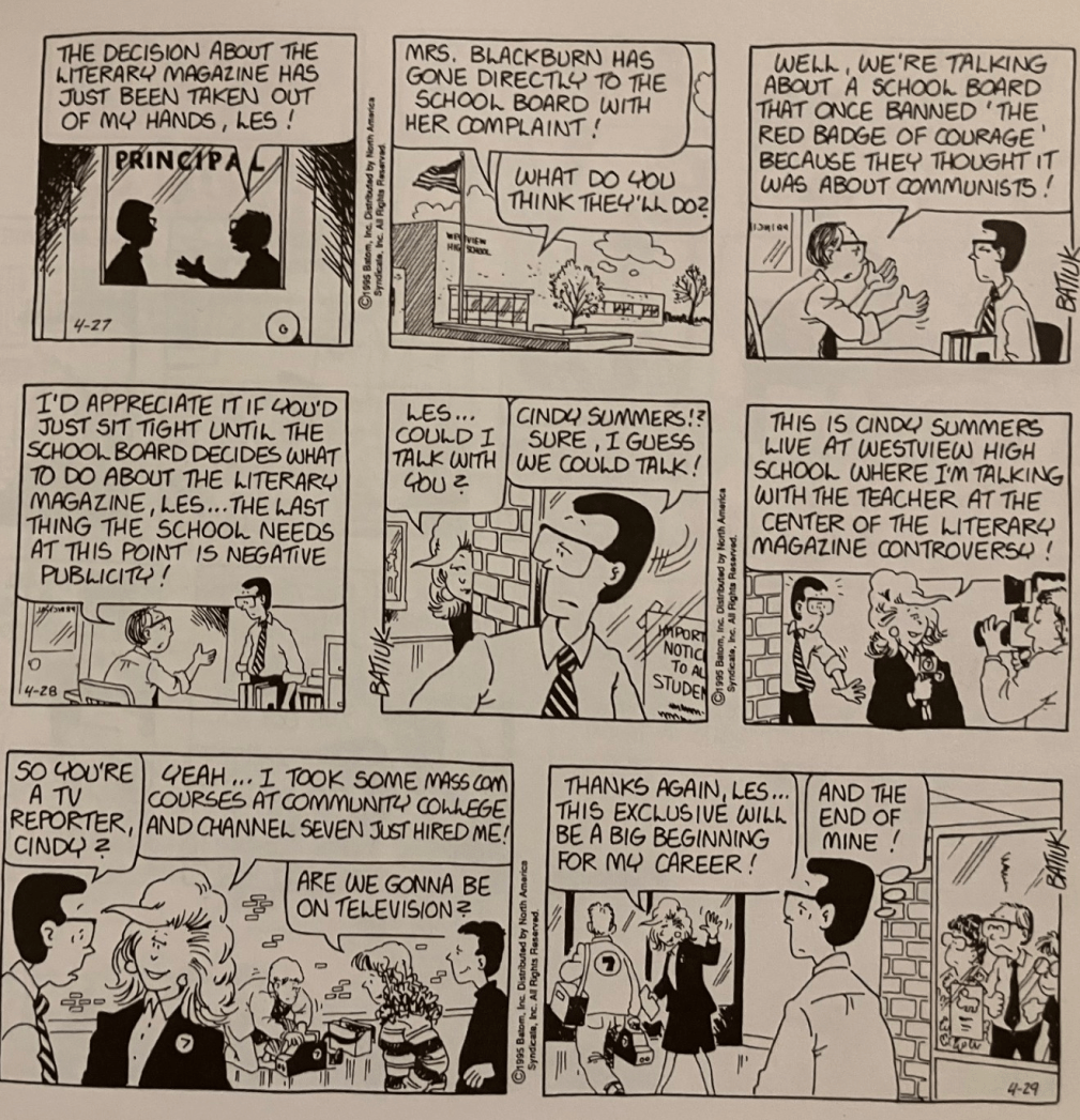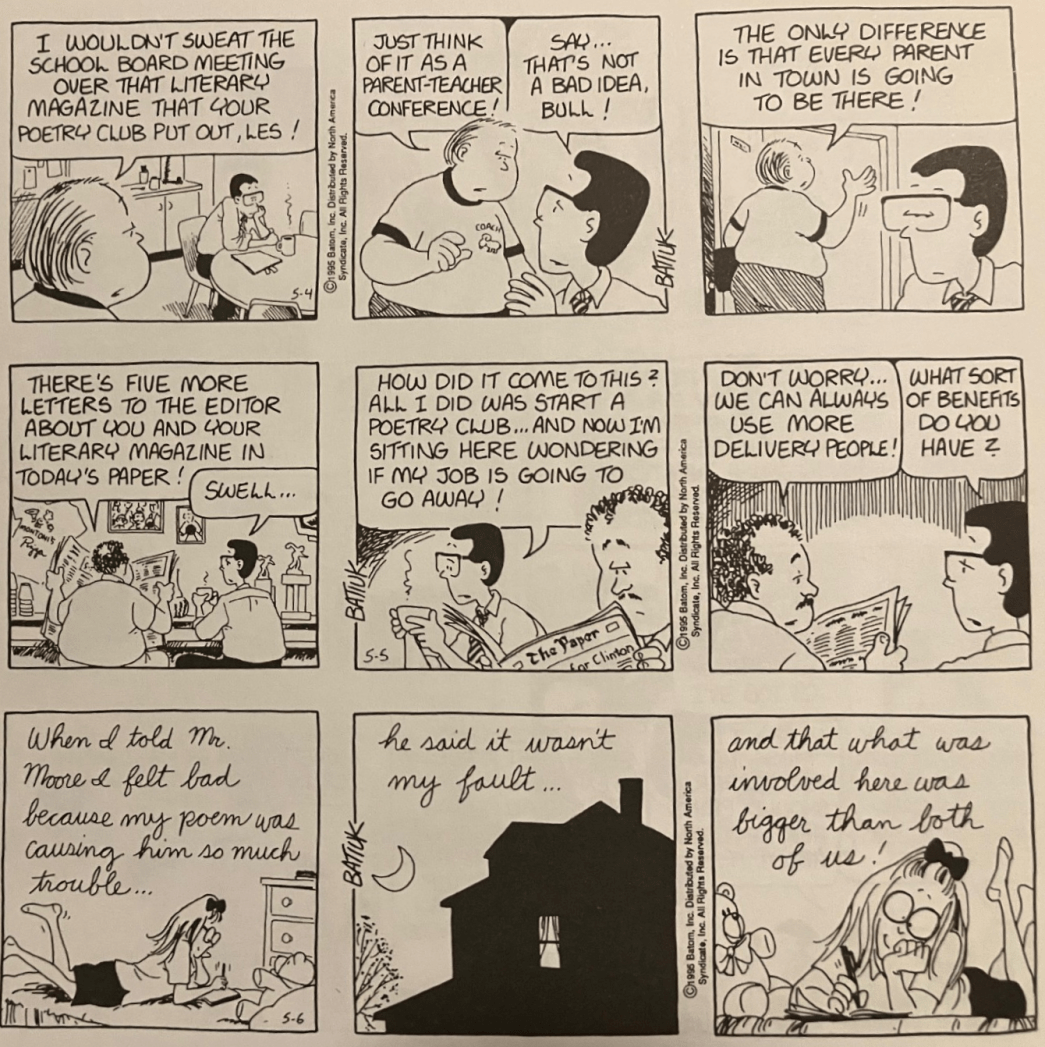 Thanks for the trip down memory lane, CBH! One thing that strikes me about these strips: There are actually stakes in this story. Les worries about being fired. And there is actually a concrete complaint: Roberta doesn’t want her kids reading other students’ ruminations about teen pregnancy. The current story has neither stakes nor an actual complaint.