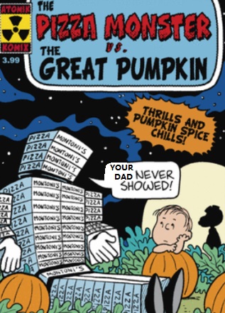 Number 2): Least favorite? The Peanuts cover. I can appreciate a tribute to Charles Schulz and Peanuts, but this is just lame. “He never showed!” TB sure recaptured the “excitement” of the Burnings© didn’t he? Wouldn’t it have been funnier to have Linus thinking he sees the Great Pumpkin, only to have the Pizza (Box) Monster slowly rising out of the pumpkin patch like Snoopy in the classic cartoon? There’s no mention of Schulz or Peanuts in the panel. Most readers are quite familiar with the scene, which proves TB isn’t fit to hold Schulz’s felt-tip.
