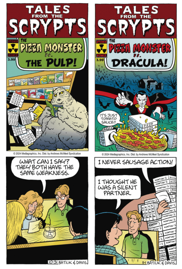 Number 1): Most tolerable? I’d have to say the ones featuring King Kong and Dracula. Why does “Frankenstein” resemble the Incredible Hulk? Also, to nitpick, Frankenstein was the mad doctor creator, not the monster. The Pizza (Box) Monster is reading comic books along with The (Inedible) Pulp🙄. Look kids! Comics! Catch the excitement! TB’s comic book obsession to insert comic books into everything is beyond annoying. My least favorite one was Tuesday’s unattributed Peanuts themed theft.