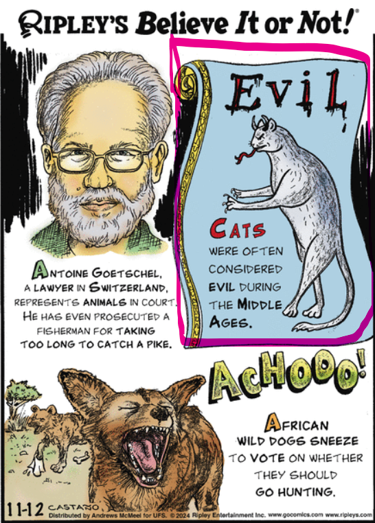 Yeah, the latest artist of Ripley’s Believe It or Not! isn’t as good as his predecessor, the late great John Graziano. To be fair, I imagine the image of the Evil Kitty was reproduced from a middle age tapestry or woodcut.