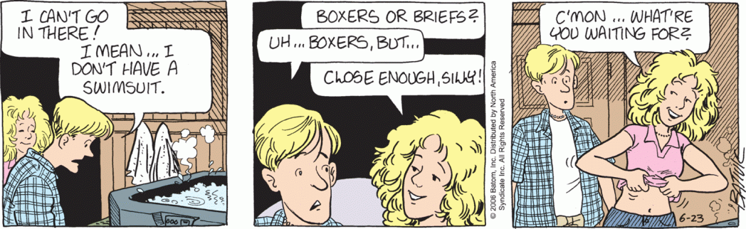 Just 4 panels of people you knew nothing about. But did you already get the character dynamics? Okay, the backstory here is that Hunter and Angela showered to get the saltwater off their swimsuits (the strip was set in the USA, but 2 Aussies made it, based on what they saw from US movies/sitcoms). The 2 teenaged boy idiots get turned on by this because…Well, they’re IDIOTS and TEENAGED BOYS, you’re not supposed to see girls in a shower, even if they’re wearing what they were wearing in public all day.