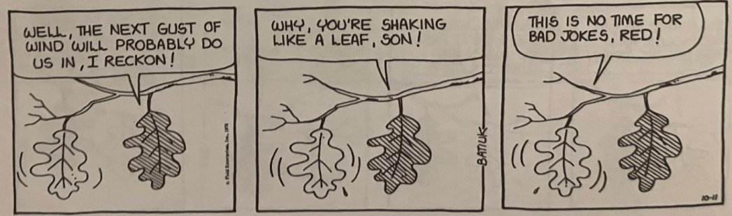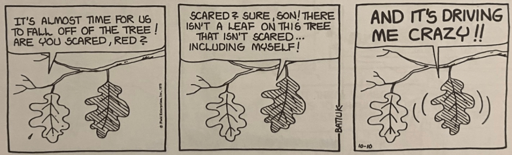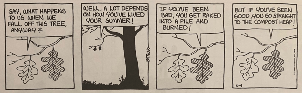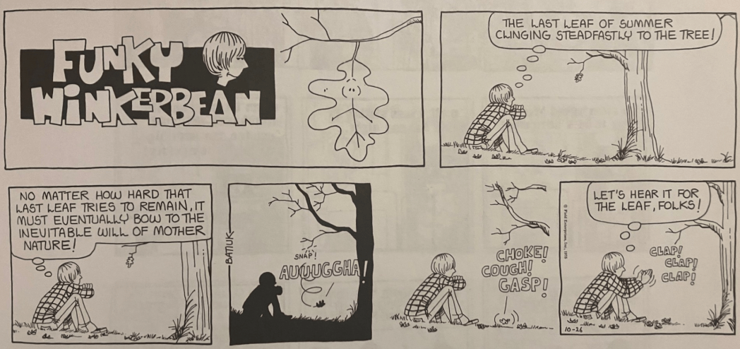 The leaf strips were like a certain class of <i>The Far Side</i> strips, where tiny creatures would face existential crises. The leaf conversations were basically examinations of life, that anyone can relate to. We all have our time to turn color and fall off the tree. And this was a very sweet, gentle way of examining it. Highly derivative of Peanuts, but creative enough.