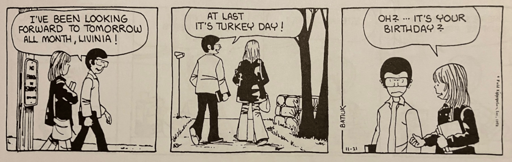 I’m thankful for the hosts who kept the website going after Funky Winkerbean ended. I’m grateful for CBH and BJr6000, who continue to find things to blog about and separate from the increasingly dreadful Crankshaft. I’m thankful for the friendly commenters who make this discussion informative and fun.