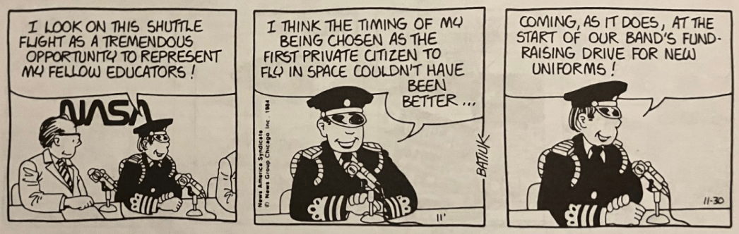 In 1985 Christina McAuliffe, (who looked eerily like the female astronaut from Batiuk’s plotline,) was chosen to be the first participant.