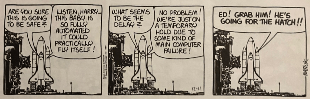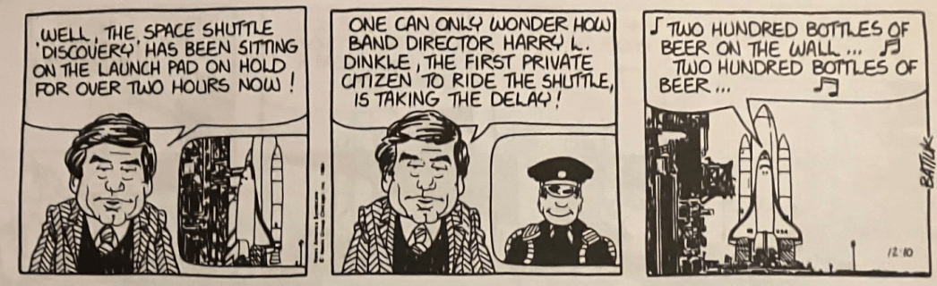 I don’t think that one strip is depicting Dinkle landing the shuttle. I think it’s two astronauts talking to each other with the, “What’s next?” and “Aim towards Earth”, and then Dinkle pipes in with the, “Are you sure you’ve done this before?”