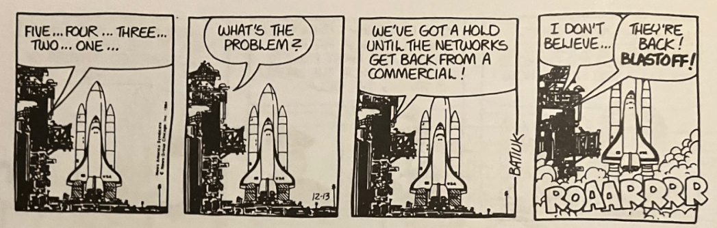 I hate to belabor the obvious, but these strips are from the era when Batiuk was not promoting his strips as being an accurate reflection of real life. This story is just being played for comedy, not for an accurate reflection of the space shuttle program.