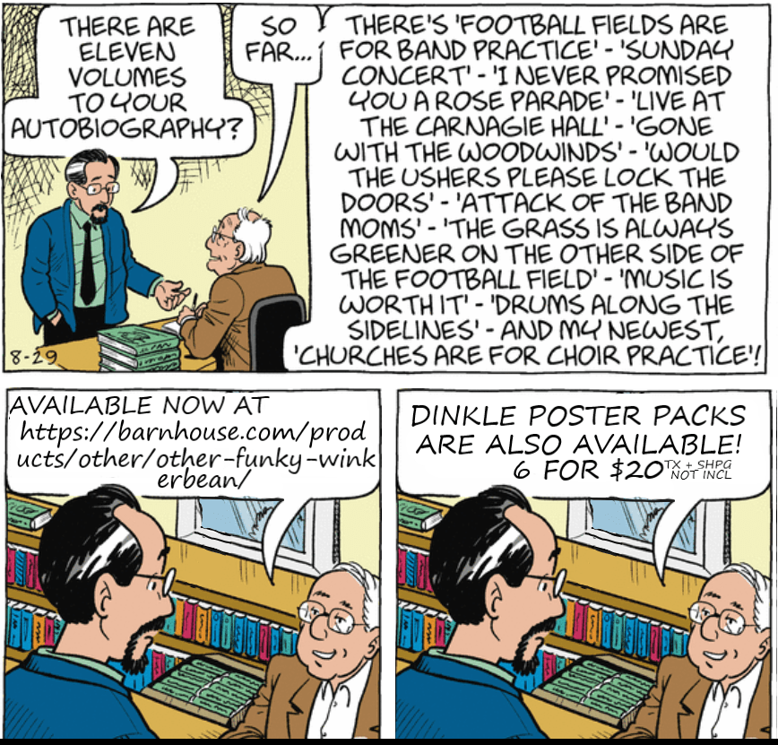 Rather than shilling for all eleven compilation books in one giant word balloon, Batiuk should have had Dinkle mention only a few of the books with titles that were intended to be funnier. “Sunday Concert” and “Music Is Worth It” could obviously have been dropped because they weren’t even intended to be amusing titles.