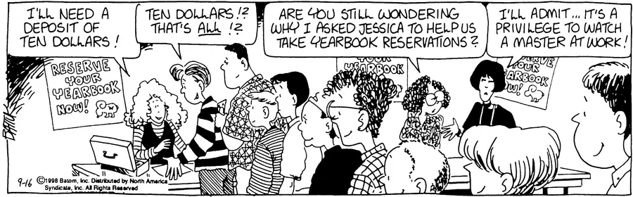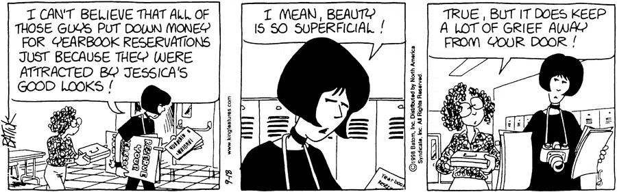 On the one hand, the ‘unattainable hot girl draws the interest of a pack of dudes’ is a trope Batiuk has drawn from again and again and again, as well as showing women being jealous of the benefits other prettier women get. On the other hand, he also shows men as being desperate losers at the bottom of the ladder comparing themselves to other guys.