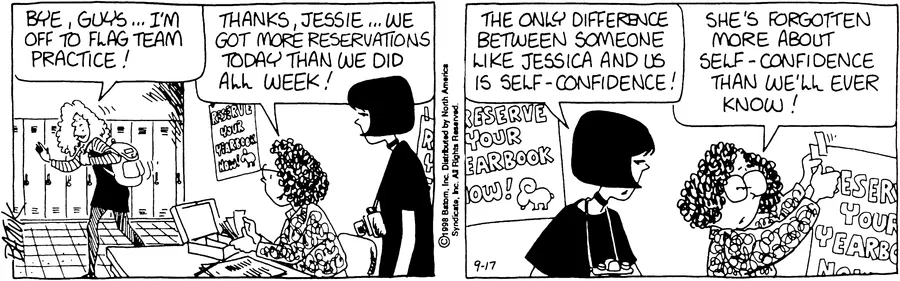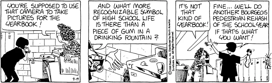 Which i think is central to why Chien is so well-liked. Smug disdain is the default setting of the Funkyverse, and the whole strip ran on people taking high school too seriously. So a character who didn’t was refreshing. On top of that, Chien was a plausible but specific high school archetype, which added to the genuine realism the strip once had.