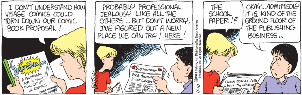 Durwood strips without Pete manage to generally be just as insufferable as Pete strips without Durwood (the one where he creeped on Summer notwithstanding) and while Pete’s sad-sackery and endless shirking wear out their welcome about as quick as anything in the Batiukverse, he does occasionally suffer the consequences of being a miserable, lazy little man. Meanwhile, Durwood’s acquisition of the Rex Morgan MD Protagonist Lucky Horseshoe For Receiving Free Stuff™ at the end of Act II is really just as tiresome. Through absolutely no visible effort or accomplishment of his own, Durwood received: unsolicited romantic attention from the most popular girl in high school, a nose job, an MBA in pizza apps, a management job at Montoni’s he was not at all qualified for, multiple free/reduced price places to live, a spot on the Lisa’s death gravy train, multiple jobs riding on Pete’s coattails, lots of free flights, an Eisner Award nomination, Phil Holt’s estate, a magical age-shifting child, etc. etc.