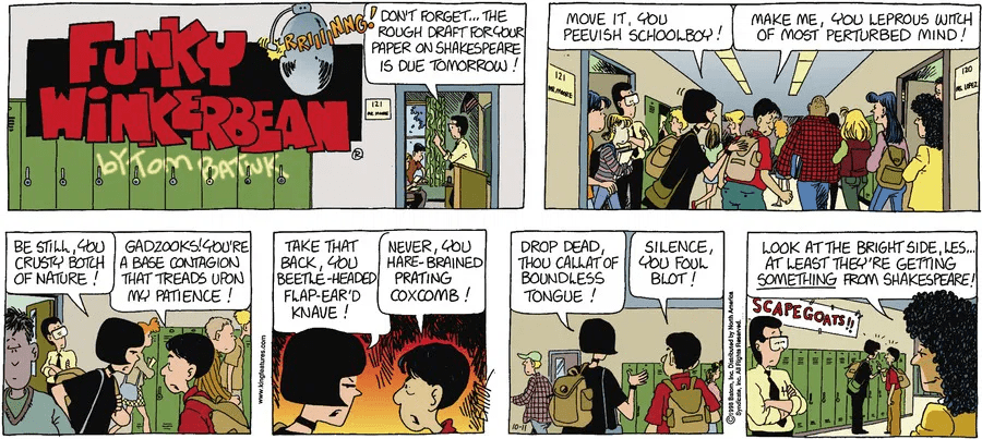 As an insufferable nerd and recovering smug literary elitist, this strip brings back fond memories of my high school clique thinking we were top shelf quirky shittalkers for jokingly calling each other ‘strumpet’ and ‘wench’ rather than ‘bitch’ and ‘hoe’.