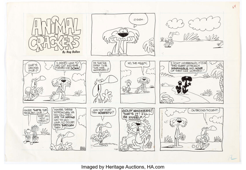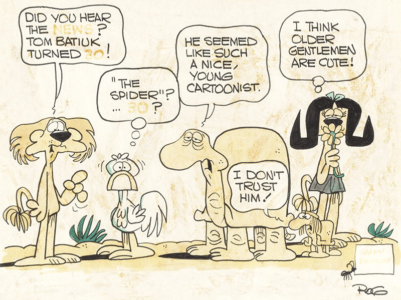 “Roger Bollen was one of the true masters of the newspaper comics page. He was the creator of Animal Crackers, Catfish and Funny Business. Roger passed away this past Saturday. To me Roger was by turns an inspiration, a wise and sage counselor, and a friend who never failed to bring a smile. When I was a senior at Kent State, I badgered, cajoled and pleaded for the opportunity to meet with him so I could pour out all of the heartfelt questions I had about cartooning and how you negotiated the path to becoming a syndicated cartoonist. He graciously spent a wintry Saturday afternoon with me talking comics and opening my eyes to the ways of the comics world. Over time we became friends who would enjoy the occasional lunch together and the chance to talk shop which, given our hermit-like existences, was something to be treasured. The cartoon above was commissioned by my best friend from college and created by Rog for my thirtieth birthday. It has remained framed very staunchly on my studio wall these many years. When Roger left comic syndication to work in children’s books and television, some of the heart disappeared from the newspaper comics pages. I missed his work and I miss the man.”