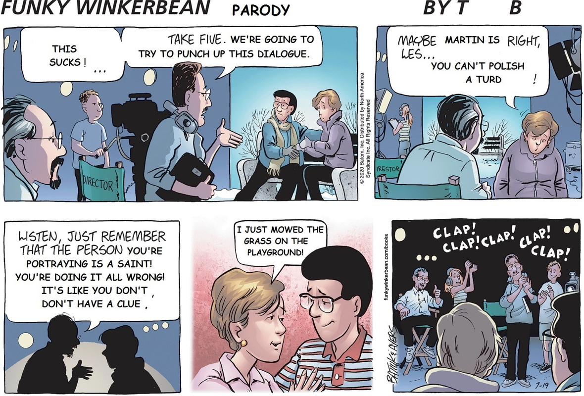 Classic old school FW parody strips. Well done. Hey, remember the first “Lisa’s Story” movie, when Les went to Hollywood, saved Mason Jarre’s career, and left in a huff when Hollywood tried to turn his book about his wife’s horrible death into some sort of sick soft-core porn movie? LOL man, that Batiuk and his zany Hollywood revenge fantasies. He may be an affable bloke, but man, he sure does carry a grudge.