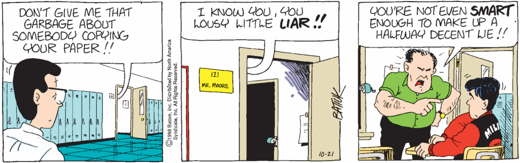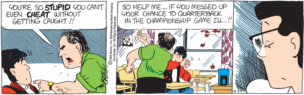 It’s been my impression on a number of occasions over the years that Batiuk really doesn’t have an issue with bullying. He just has an issue with people like him being bullied. That’s why he thinks that Chien bullying the football player is hilarious, whereas if the roles were reversed he’d show it as proof-positive of the bully’s irredeemableness.