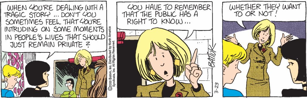 Interesting that in the strips featuring Cindy even Les and Durwood seem to realize she’s talking out her backside. Yes, the public has the right to know, but that doesn’t abrogate a reporter’s responsibility to be a decent human being.