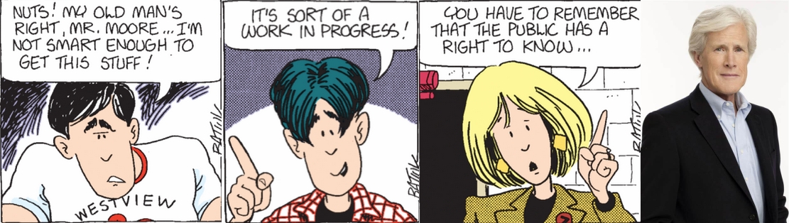 Interesting that in the strips featuring Cindy even Les and Durwood seem to realize she’s talking out her backside. Yes, the public has the right to know, but that doesn’t abrogate a reporter’s responsibility to be a decent human being.