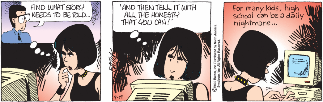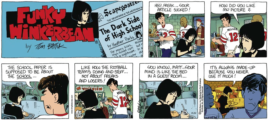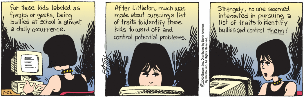 Bullying as a cause for Columbine has mostly been disproven, but in 2000 was all in vogue. It’s part of what gave the shooting the damnable mystique feeding 25 years of mentally ill outcasts obsessively replicating the narrative. Batiuk is feeding into that same mystique here and it is pissing me off.