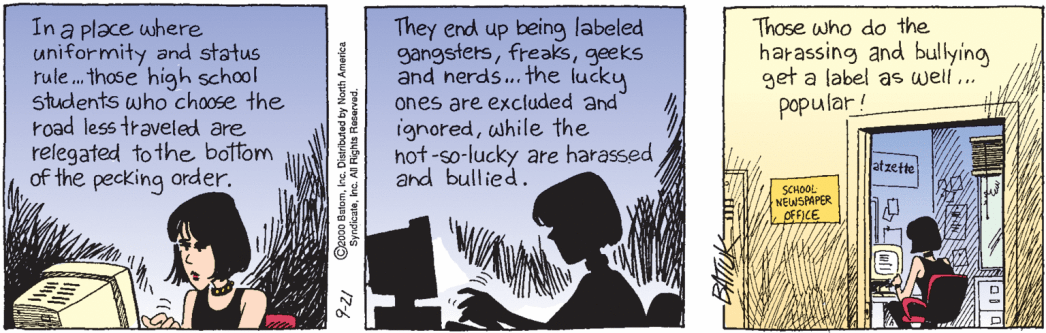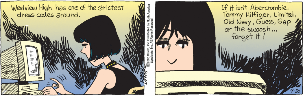 Anyhoo… about the “dress code” “joke”… Batiuk lists SEVEN brands for the “accepted clothing”. That… doesn’t sound particularly “elitist”. (Especially when you’re including Old Navy and The Gap, stores I never particularly considered “high end”.) This really seems like a case where the “rule of threes” should have come up. Name THREE high-end brands, and you’ve made your point. List half the stores in the mall, and it feels like you don’t have a point at all. (But then, Chien probably got all her stuff from Hot Topic anyway, like a true poser.) (Also, “the swoosh”? You just named six other brands, and you can’t say “Nike”? Did the other companies pay for product placement, but Nike refused?)
