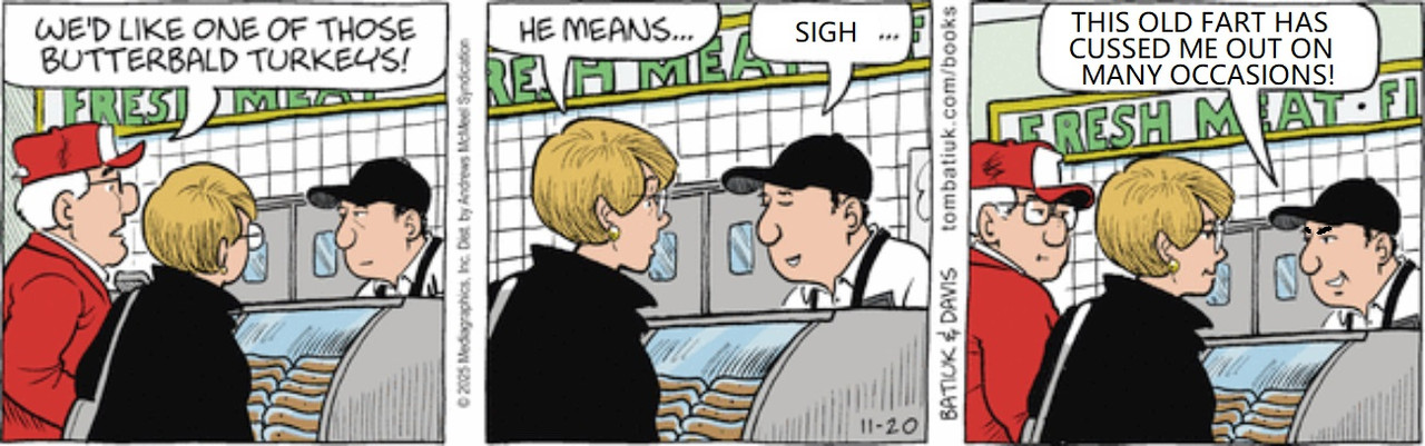 One might request Butterball (or other preferred brand) turkey from the deli counter if they were buying it as sliced luncheon meat. I suppose you could by a whole cooked and refrigerated deli counter turkey if you wanted to as well, though I cannot imagine why anyone would want to do that. It certainly isn’t turkey the way one would typically serve it for thanksgiving (an inference I take from this strip given when it is printed).