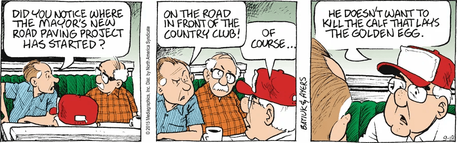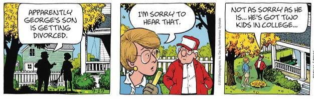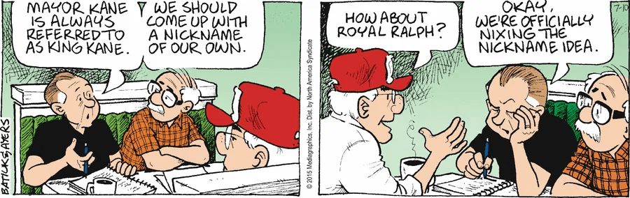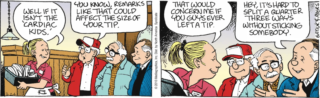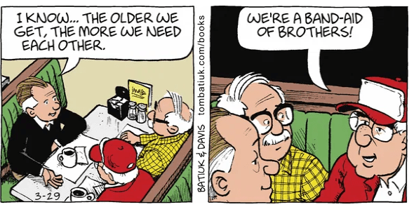 Why are Ed and George friends? The out of universe explanation I came up with is that Batiuk realized around the late Aughts that a crew of old guys eating out, as they do, would make an easy tableau for endless jokes. But it just being Ralph and Ed was missing a certain acid and bite. There’s no other named male characters of the same age except George.