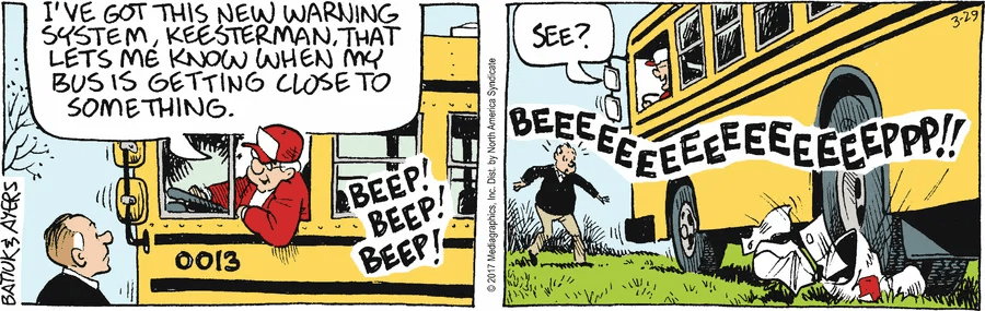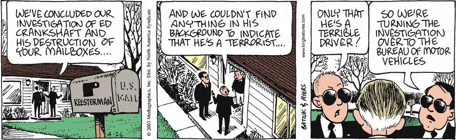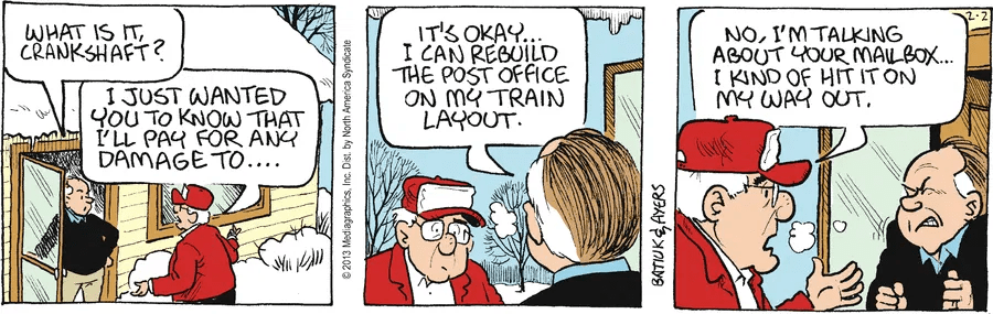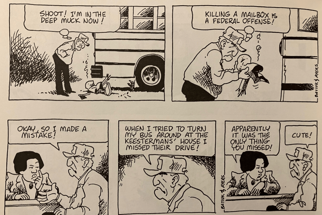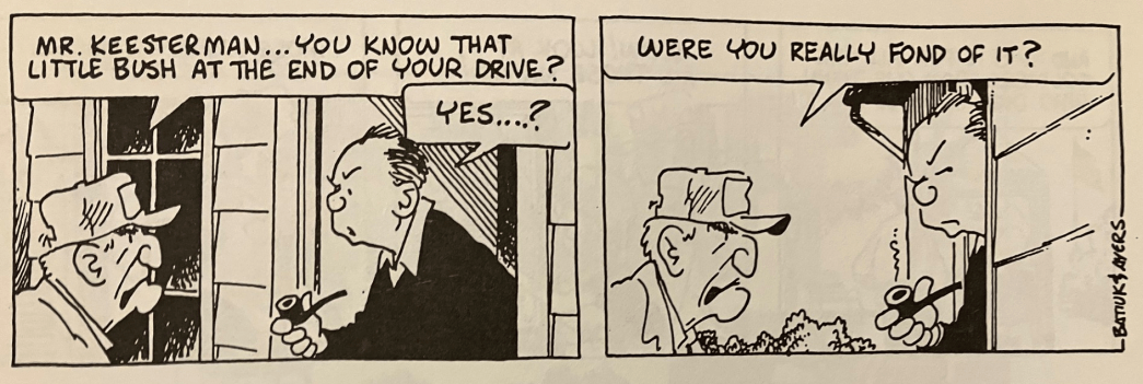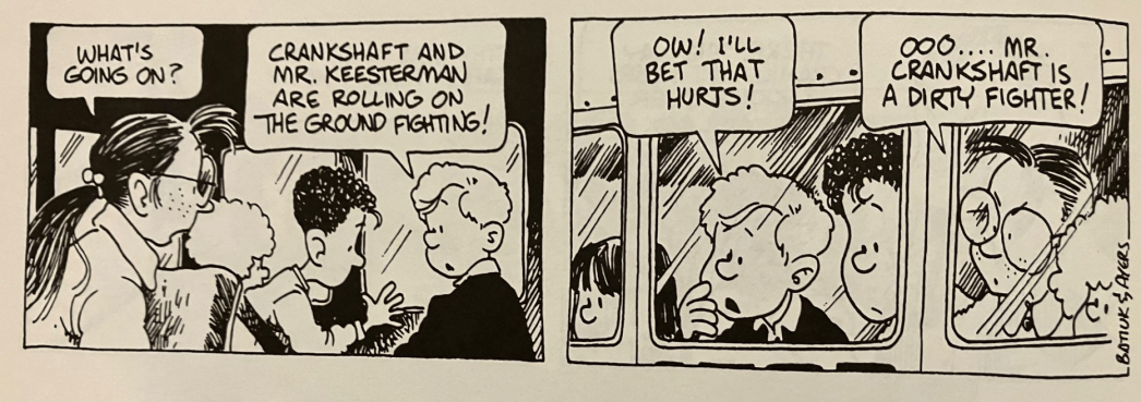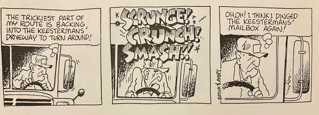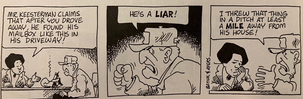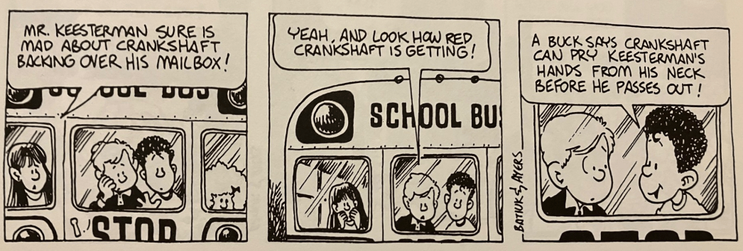 For the first few years, Keesterman doesn’t seem to be any kind of friend of Crankshaft’s. Running over Keesterman’s mailbox is, from the beginning, inserted as a fully developed running gag.
