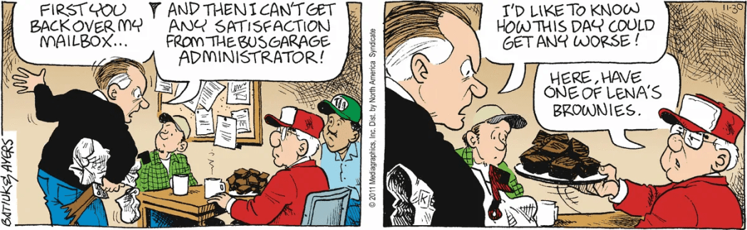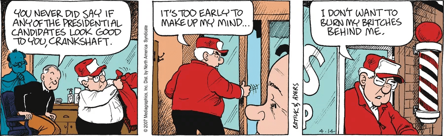 To clarify this deep dive, I don’t have access to all of Crankshaft. GoComics only goes back to 2003 and for many of those years Sunday strips are not included. There are Crankshaft paperbacks covering the first four or six years. Then there is the book on baseball and the book on Alzheimer’s, these pull relevant arcs and, infuriatingly, erase the dates on them. But from what I have, this is what I’ve learned.