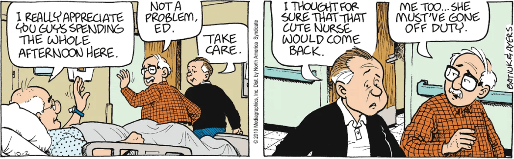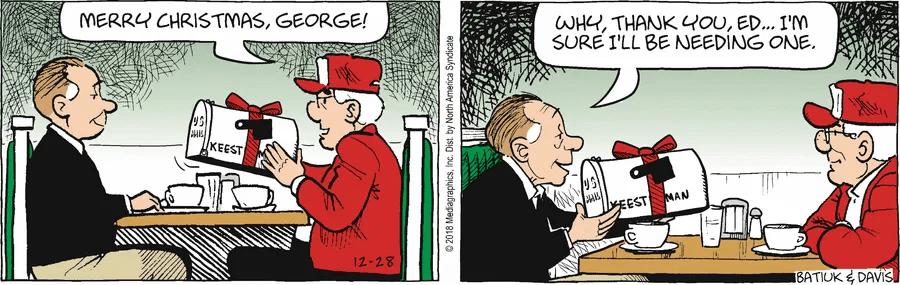 And thus the strange juxaposition between Ed and George at the Diner and Crankshaft and Keesterman at the mailbox. Where one month we would get George and Ralph visiting Ed in the hospital.