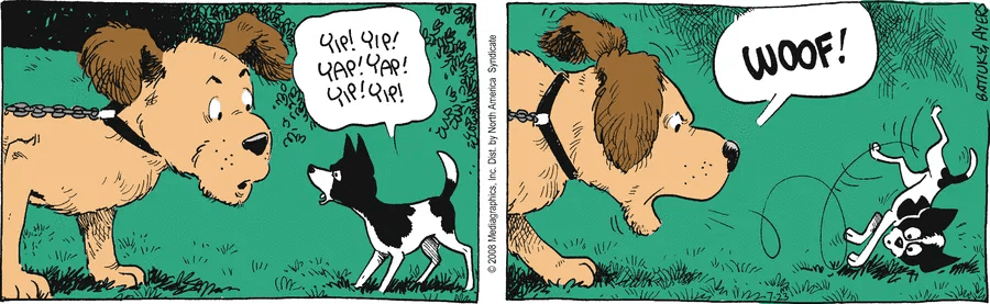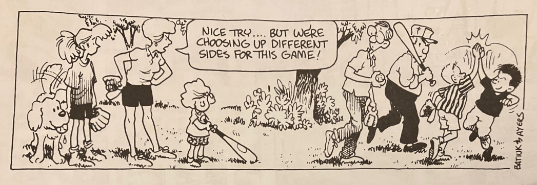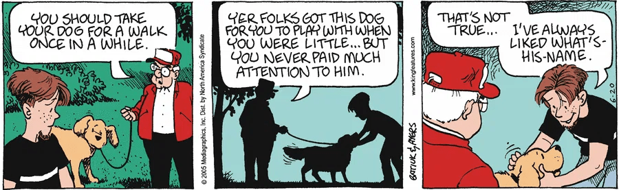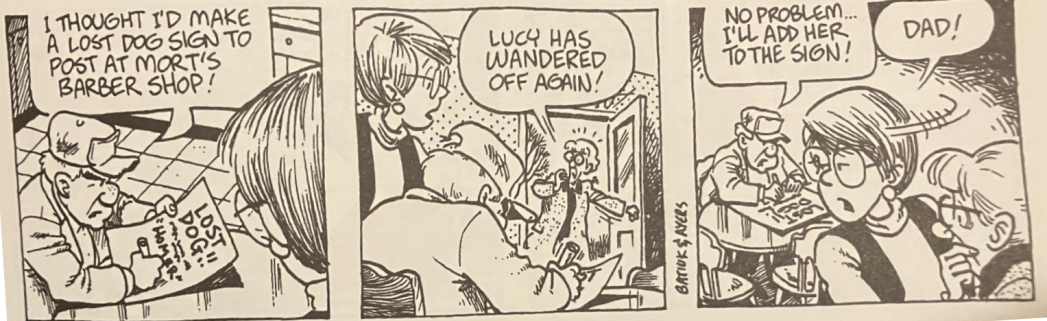 This strip displays something I wish Ayers and Batiuk had consciously cultivated, especially in their later years: put kids and pets in the damn background of strips! I’ve talked at length how the consistency of the physical locations in the Funkyverse give it real tangibility. I wish we had that same consistency with the people living in those locations.