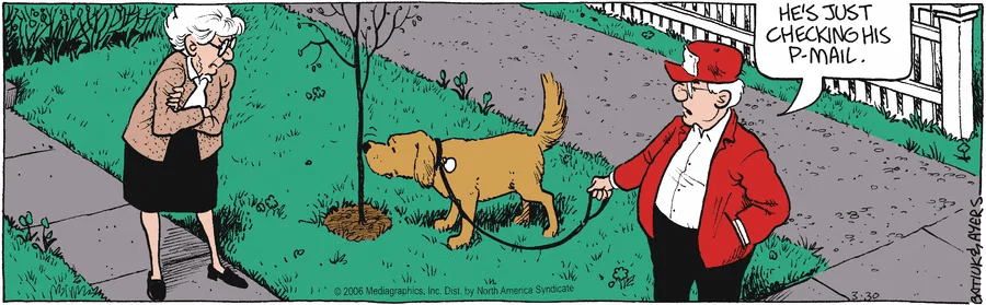 “Okay, Skip, lemme have this last slice of pizza and I’ll give your readers a real inside scoop! When the time came to send my finished art to the syndicate, I would sandwich them between cardboard, secure it with tape, write the mailing address on the front, and then take it to the local post office! There I would buy stamps and affix them to the package! The clerk would postmark it and put it in a large bin with other parcels so it would get sorted for eventual delivery. Then I would walk home and start the process all over again. First I’d take a pencil and paper, then I’d…Skip? Why are you passed out on the tabletop, Skip?”