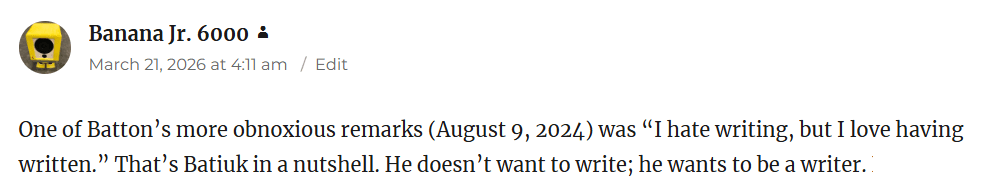 But I know that my dear Banana Jr. didn’t mean ‘loving having written’ in exactly the way I do. He’s clear about that in the rest of his comment.