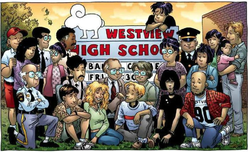 Bull, before his ankles became invisible, and wife Linda. Les still sports his helmet-hair. The caption when you “mouse over” (then vice-principal) Nate identifies him as a “former Vietnam vet” (?). Forgotten “Miss Mancuso” is looking daggers at Linda for some reason, and security guard Cliff seems to already be daydreaming of retirement.