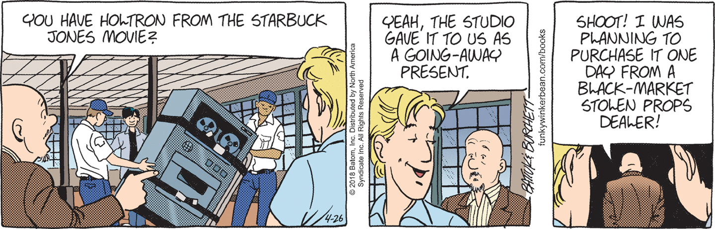 Funky Winkerbean loves its needless conversation. Especially in Tom Batiuk’s publishing stories, where he re-creates his own fantasies for his own entertainment. He’s far more concerned about meticulously outlining every single step of his ego wank, than he is in telling a story anyone on Earth wants to hear.