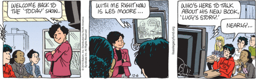 A conflation of “book launch” and “launch party”; Funky coerced Les into having his BLP for Lisa’s Story at Montoni’s Pizza. Tom Batiuk had his book launch for Lisa’s Story at Luigi’s Restaurant in Akron (the real-life model for Montoni’s).
