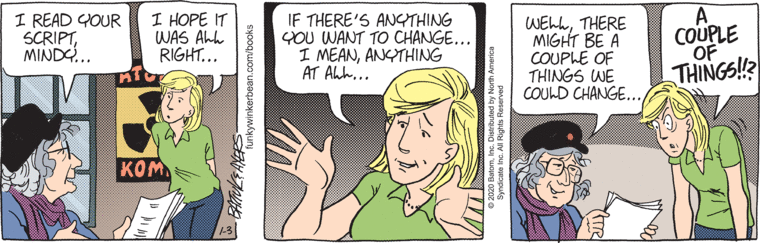 In my dissertation yesterday regarding the traits of various FW characters, I called Phil Holt “a nasty, sarcastic little prick.” His partner Flash once diplomatically described him as a “grumpy guy who spent most of his time (emphasis mine) at war with the world and everyone in it.” Most of his time. Yesterday (or a few minutes or hours ago in strip time), Holt came thisclose to telling Pete to shove “all of these ideas of yours” up his ass. Today the Silver Alert, uh, Silver Age Duo have come a knockin’ to borrow a cup of Darin and Pete’s creative sugar.