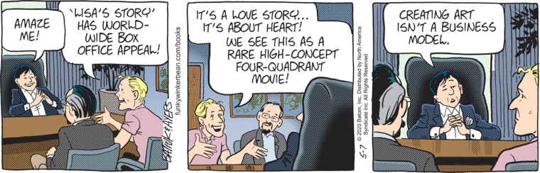 “It’s a romance movie! There’s never been one of those before! I mean, sure, they literally go back to 1896, but still romance! Surefire hit! And so what if the movie ends with the heroine wasting away and dying rather than finding the man of her dreams?” Does Batiuk think this is supposed to be a good pitch? Stating the genre of the movie isn’t a convincing argument for why it should be made.