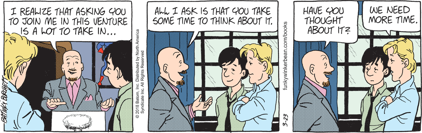 It is one of the most understandable moments in recent Funky Winkerbean history. You can see the relief washing over him, finally losing these two deadweights without having to incur any pushback from Mason. I expect it is like the feeling when an awful coworker, one who could never get fired because of a relation/connection to upper management, decides to leave. Mr. Johns is one of the least disagreeable shmucks in the recent history of this comic strip and I’m almost happy for him today.