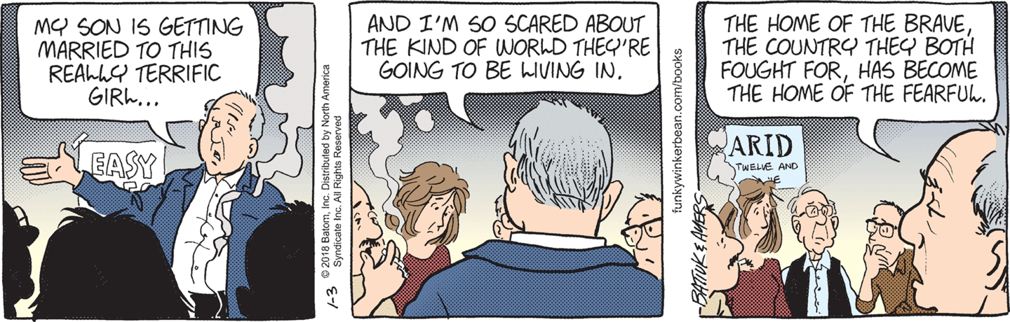Of course, no list by Batiuk of What Ails the World would be complete without a mention of climate change, and everyone’s complicity in same: “We’re sending cruise ships…” Watching glaciers melt, or grass grow, or paint dry would be far more interesting than wading through a week of this dreck.