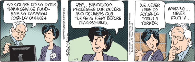 Becky is preening with pride today. So smug at having found a great, time and hassle saving, idea that Dinkle never considered. I wonder how much this Bandigogo service takes away from their fundraising bottom line? The employees at the frozen turkey warehouse distribution center need their pay, as do the desk drones processing these orders, and the numerous fast talking sale pitch charlatans who undoubtedly prowl the band conferences looking for harried Band Directors juggling too much one-handed who can be persuaded to outsource.