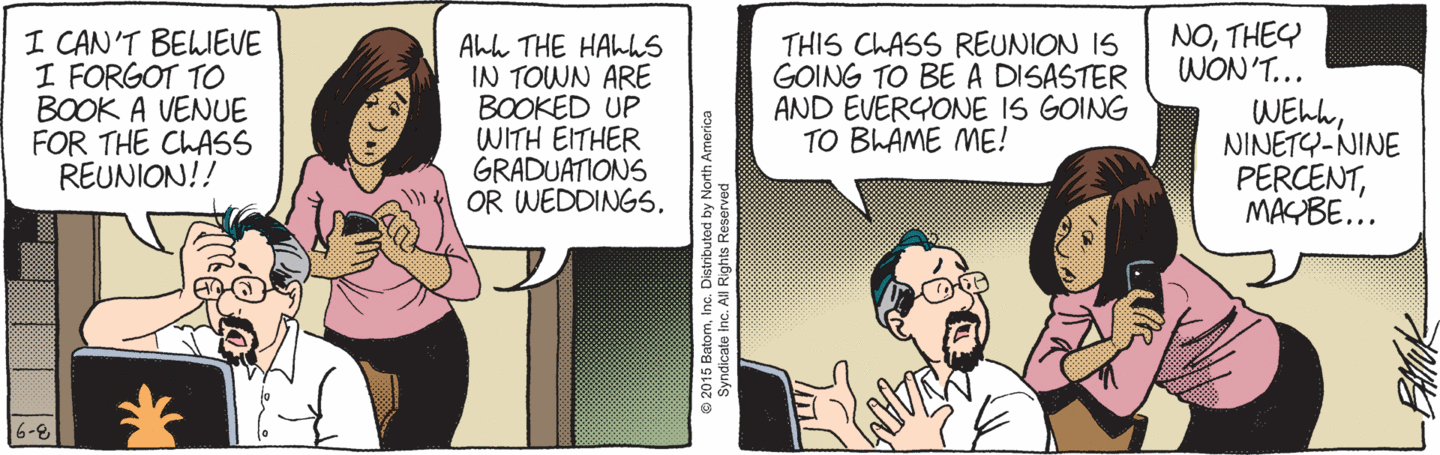 The red and blue balloons (though the school colors are red and white) have been filled, and the kraft paper and tempera paint banner has been haphazardly Scotch-taped to the folded up bleachers. Everything appears ready for the coming reunion. You’d expect Reunion Committee Chairman Les to be displaying his base-running, smugly satisfied smirk. But Les implies that the reunion planning has been fraught with problems. OK, well, his committee did forget to choose a venue, though this issue was easily resolved (albeit to the detriment of Westview’s basketball-loving youth). Les has overcome his lack of a Facebook page and a suitable high school portrait, and has managed to delegate the setting up of the Lisa shrine, yet he’s waiting for the other shoe to drop. And here comes Barry Balderman to drop that shoe…