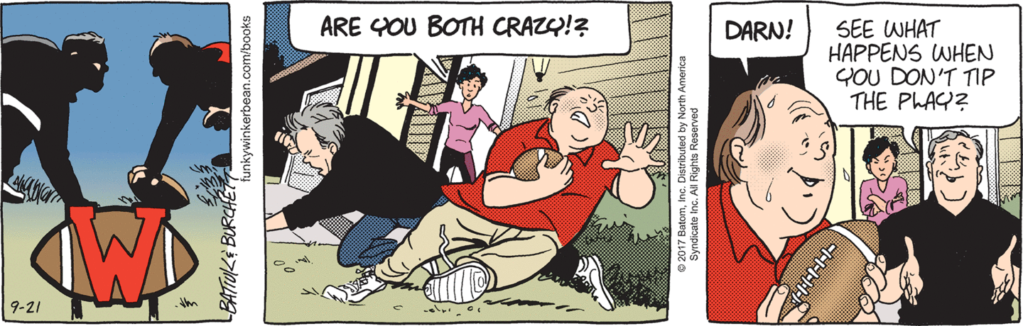 Bull’s wife Linda seemed to appreciate the visits, but probably thought she’d seen the last of Buck that night he revealed that he was in the same state of mental decline as her husband. But Buck was back a couple weeks later. And now that football season’s underway and the leaves are falling (hurtling, actually, judging by panel 1), here he is again. Linda doesn’t even attempt to hide her disdain.