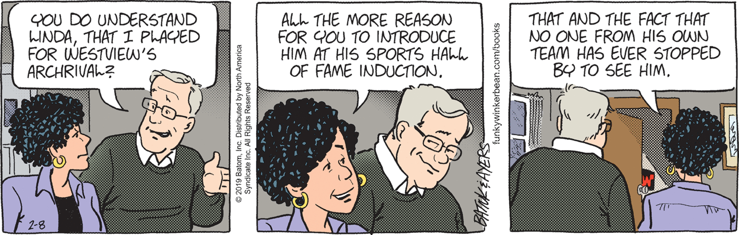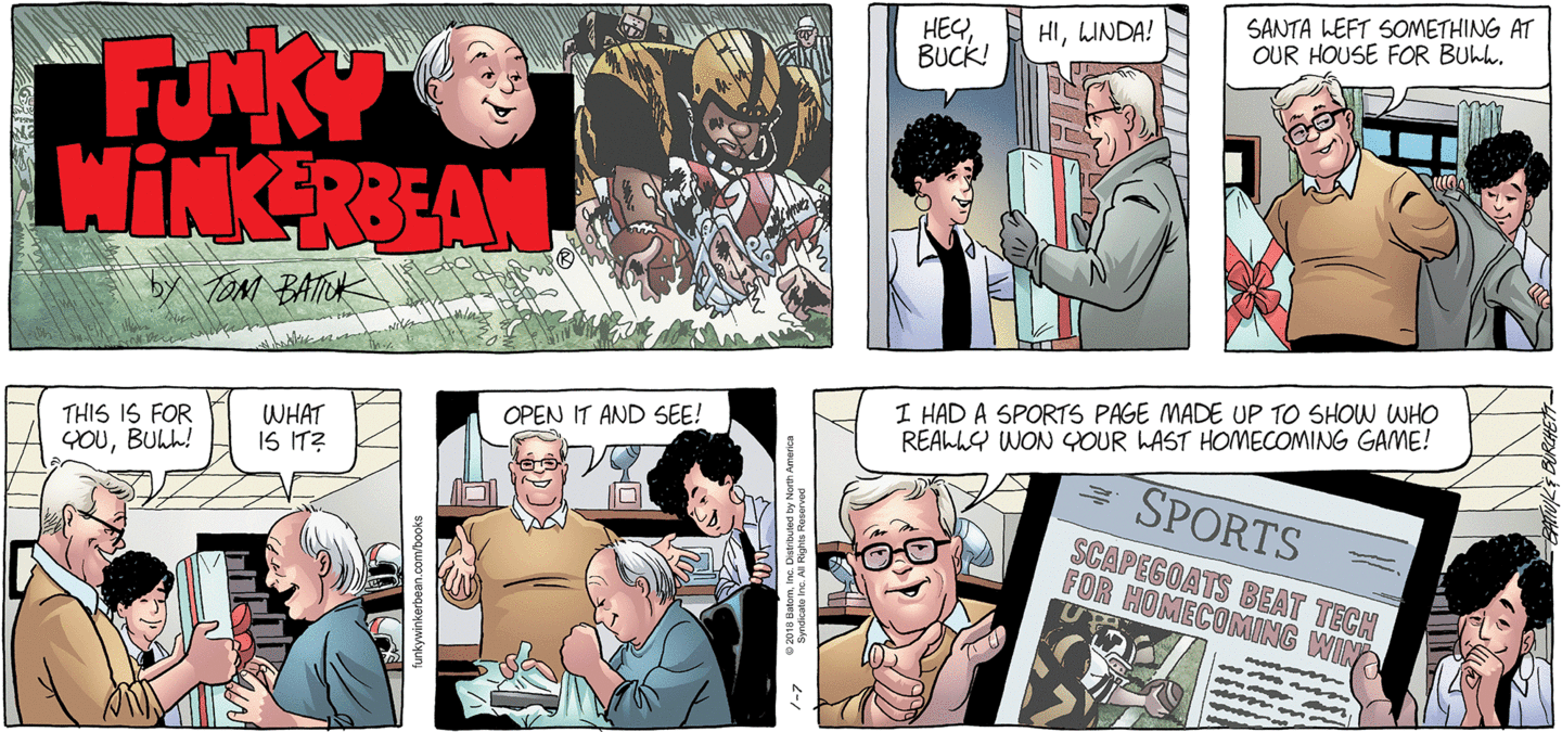And of all the dangling plot threads to pick up, TB decides to trot out Buck Bedlow, showing up as he always does, unannounced, at the Bushka residence. Buck, you’ll recall, showed up a year ago, to facilitate Bull’s rehabilitation from bullying, belligerent gridiron failure to enfeebled, doddering legend. The two erstwhile rivals reenacted their gridiron glories on Bull’s lawn. After they viewed Dinkle’s video demonstrating that Bull did indeed get the ball over the goal line on the last play of his last game, Buck presented Bull with a framed, fake sports page touting Westview’s “win.” This was followed by a trip to snow-covered Scapegoat Field to dig up a piece of turf from the end zone.
