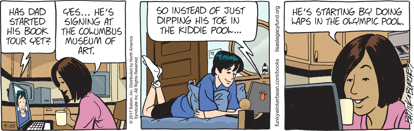 Alas, Sunday’s comic was an omen and Les Moore’s tour of contempt continues in today’s strip. Yet another person (one of Pete’s relatives, perhaps?) has been standing in line to meet the author of a book that they know nothing about? Skinny McBrowncoat has never heard of Les or the previously released Lisa’s Story book? I mean, that is believable, sure, but did he just see a line at the bookstore and decided to stand in it?