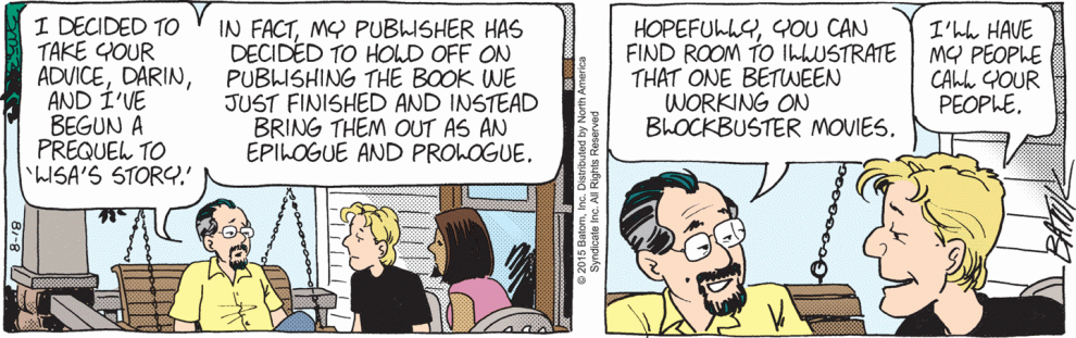 Alas, Sunday’s comic was an omen and Les Moore’s tour of contempt continues in today’s strip. Yet another person (one of Pete’s relatives, perhaps?) has been standing in line to meet the author of a book that they know nothing about? Skinny McBrowncoat has never heard of Les or the previously released Lisa’s Story book? I mean, that is believable, sure, but did he just see a line at the bookstore and decided to stand in it?