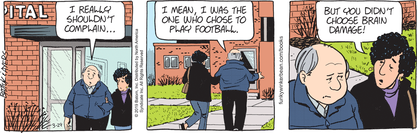 Today, though, we’re at “three months ago”. That places this flashback in early July, and yet both Buck and Bull are wearing coats? I mean, this is presumably still an October funeral, right, what with the falling leaves colored a bright orange hue? Heck, this doesn’t even line up with Buck’s mid-September visit, where he and Bull stroll out to Jerome T. Bushka A&L Automotive Stadium, as neither man is wearing a coat then.