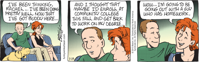 And it’s one thing for an individual to say that they personally are putting on the “freshman fifteen” (grad school fifteen is just lame and continues the long Batiukian tradition of thinking just switching two words is enough to be hilarious). It’s another thing for Becky to “joke” about this totally behind Rana’s back to her dad. It just comes off like complaining about her getting fat, which is laughable, but totally in line with the general mean-spirited nature of Batiuk’s strips.