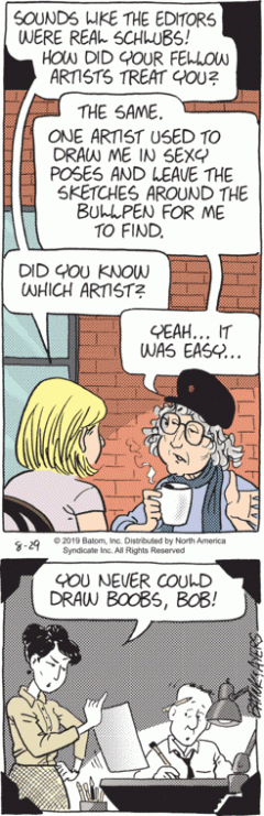 Tom Batiuk’s neither anonymous nor an amateur, but narrative coherence and continuity aren’t his strong suits either. Mandy’s persistent questioning of Ruby in itself is starting to border on harassment. Yesterday I was able to dismiss her editor’s “not bad for a girl” remark as harmless. Ruby’s male coworkers inviting her to watch porn after work, well yeah, that’s all kinds of wrong and just, well, ick. Note however that Ruby admits she “didn’t think of it as harassment then.” I’m pretty sure it was, despite what Ruby thinks, but she was able to turn the ridicule back on her would-be tormentors, just like she did that time with Boob, I mean, Bob. Ruby’s had to deal with income inequality, which sucks, but she’s clearly someone who can handle herself, giving as good as she gets. So what’s the point of this arc?